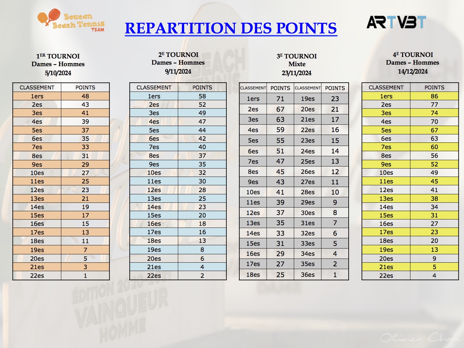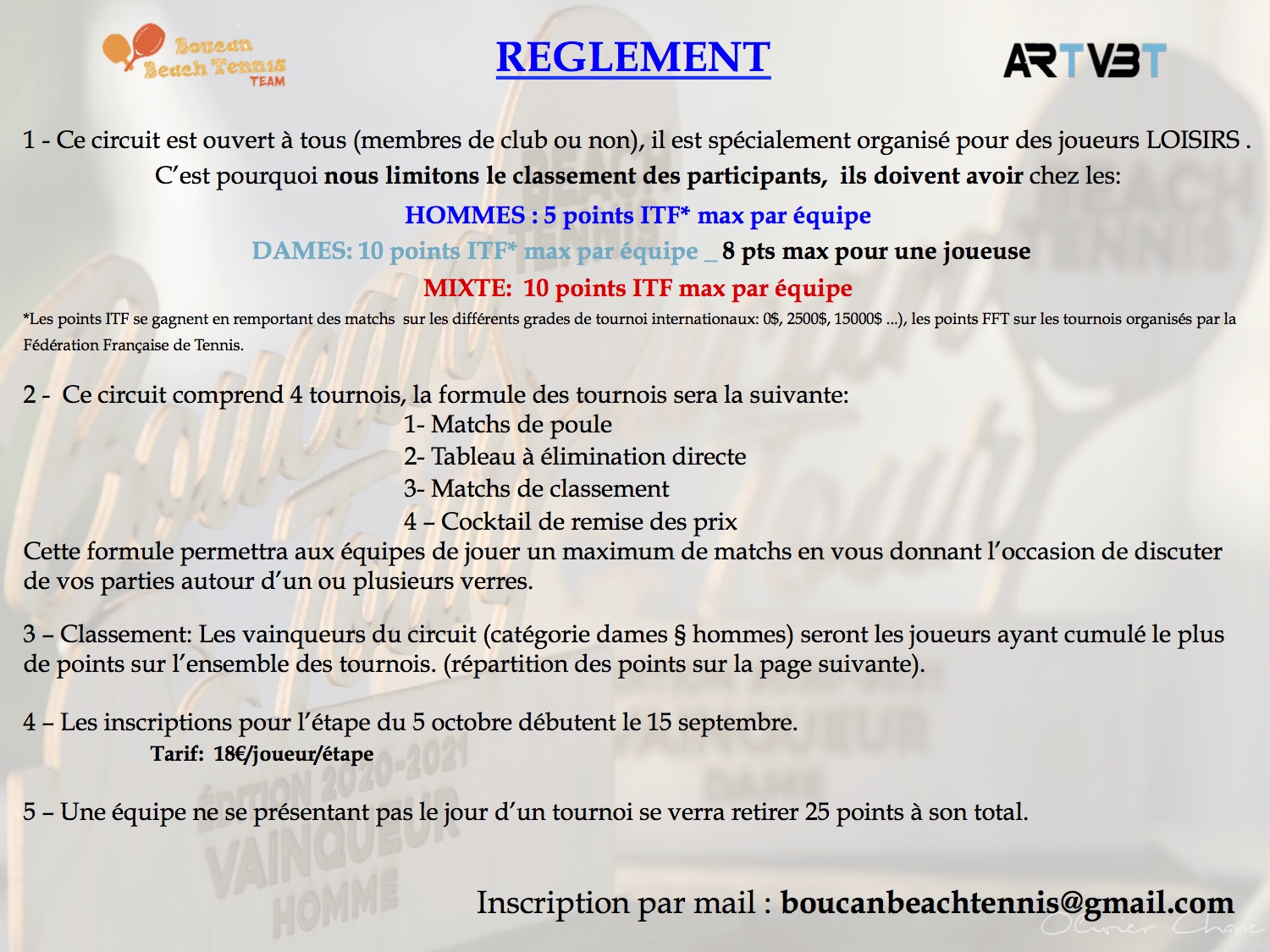 Ce circuit comprend 4 étapes, cette année les doubles dames & hommes se joueront les samedis (après-midi) 13/09, 27/09 & 15/11, le double mixte sera le 1er/11.